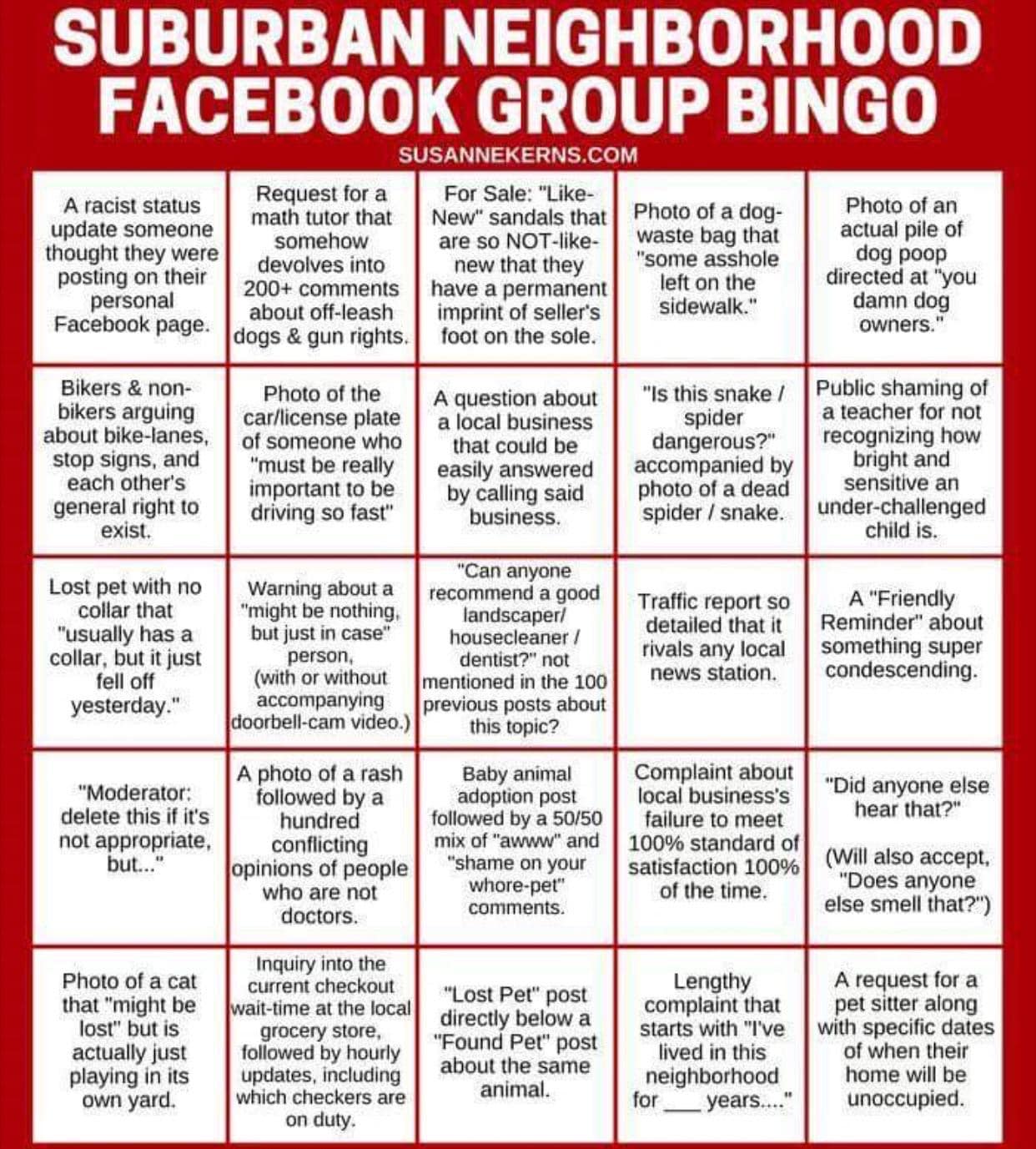 I came across this image, posted in my town Facebook group. I couldn’t help but laugh since each square is all too true. The things people say and do when they have nothing better to do.